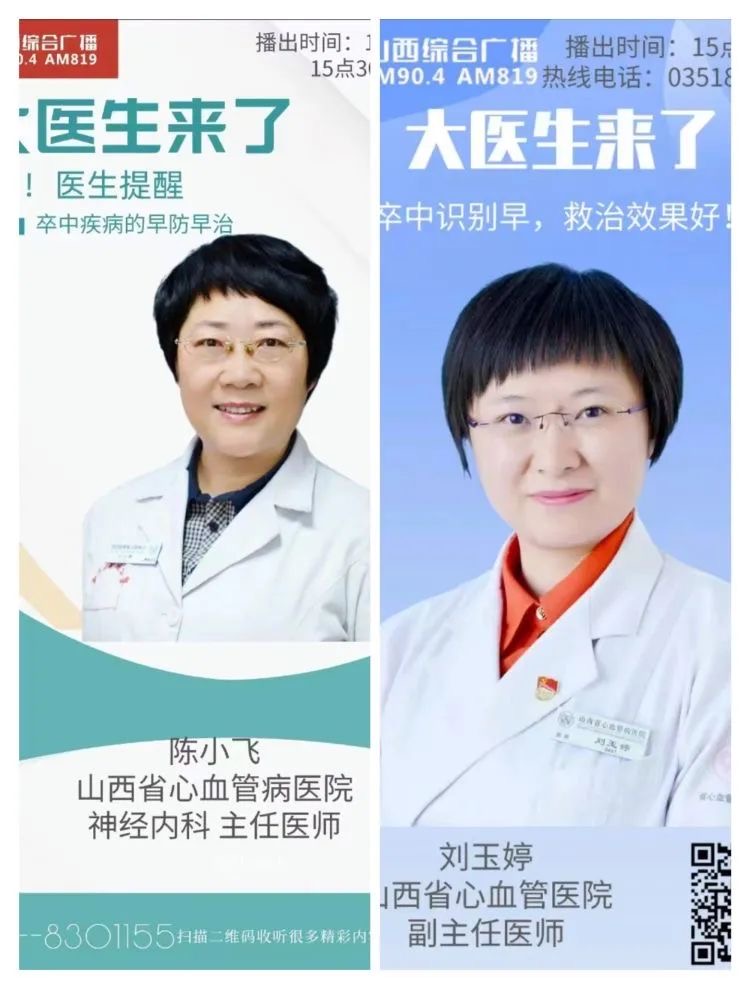 活动五:10月27日、28日神经内科德高望重的陈小飞主任、神内二病区副主任刘玉婷博士受山西综合广播电台《大医生来了》节目组邀请,进行了《卒中疾病的早防早治》、《卒中识别早,救治效果好》的健康讲座,通过讲解卒中早期识别、危险因素控制等科普学问,强化卒中一级、二级预防理念,减少卒中的发生。