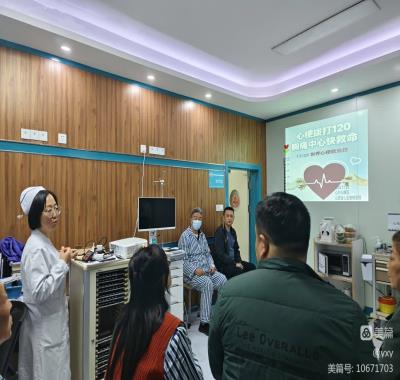 同时,我们举行了心肺复苏的教学,用通俗易懂语言讲解心肺复苏急救技能的基础知识及步骤,着重强调了心源性猝死急救“黄金4分钟”的重要性,并就如何判断病人意识和心跳呼吸情况、评估现场环境安全、正确摆放体位、胸外按压操作要领及如何评估心肺是否复苏成功等进行了重点讲解。也让发病早期出现心律失常等并发症的患者学会自救可以得到复苏的机会。