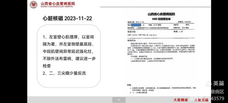 2018年体检,做心电图发现普遍胸导联T波倒置,当时无任何不适。做心脏彩超及冠脉造影均正常。2023年复查心脏彩超出现心室肌对称性增厚。半年后出现饱餐后骑车时胸憋气紧。入院体检未发现病理体征。