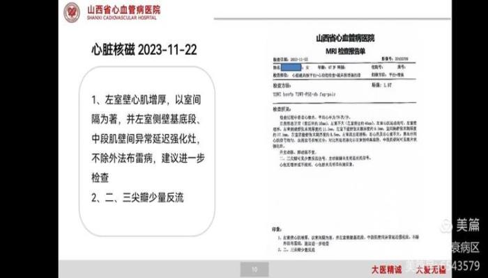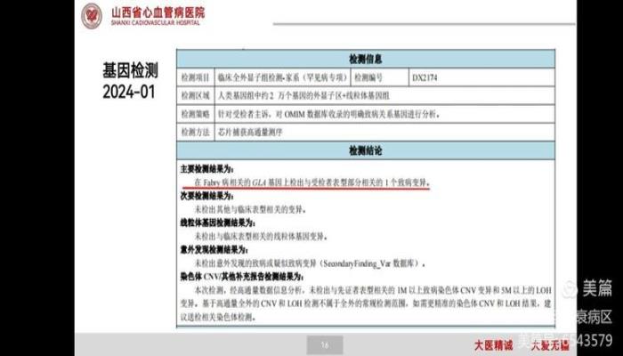 最后,基因检查结果确诊为法布雷病,心肾功能受损。给予酶替代治疗。经家系筛查又确诊一例,本例未出现心肌肥厚征。目前正在进一步完善其他检查中。