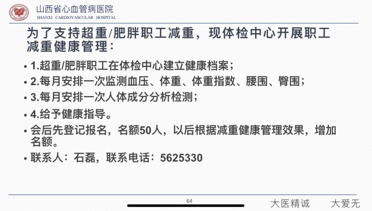 冯英主任首先对2021-2023年我院职工体检情况进行了汇报分析,指出超重/肥胖已成为严重影响人们身心健康的主要公共卫生问题。健康体检中心作为守护职工健康的重要部门,将从2024年开始对超重/肥胖职工开展减重健康管理,建立健康档案、每月定时测量体质指数、每月一次人体成分分析检测,并对过程中出现的问题给予健康指导。会后大家踊跃报名,力求在健康管理下科学减重。