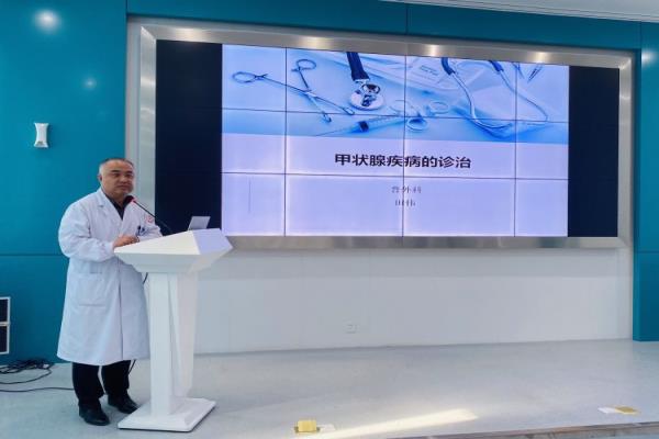 接下来,普外科田伟主任做了《甲状腺疾病的诊治》科普。田主任指出,甲状腺结节为常见病、多发病,绝大多数都是良性,恶性率只占约5%。定期体检可以早发现、早诊断、早治疗。田主任从甲状腺结节的流行病学、分类及诊断、处理原则等方面为大家做了详细讲解,倡议在场职工在繁忙的工作之余按时休息,保持良好稳定的情绪。