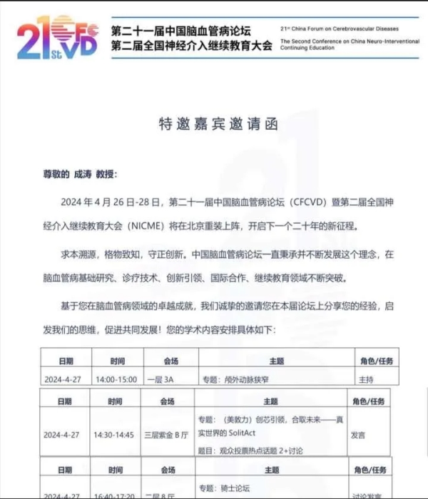 医院动态第二十一届中国脑血管病论坛(CFCVD)暨第二届全国神经介入继续教育大会(NICME)于2024年4月26日-28日在北京召开。本次论坛以基础研究-临床研究-继续教育-创新转化为主线,全面聚焦脑血管病介入和手术治疗最前沿进展,促进基础研究与临床实践紧密结合,为全国脑血管病同道们提供了深入交流和思想启迪的机会。我院神经医学中心神经介入团队王玉峰主任、成涛主任受邀参加会议。