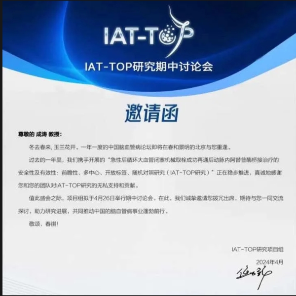 我院作为“急性后循环大血管闭塞机械取栓成功再通后动脉内阿替普酶桥接治疗的安全性及有效性:前瞻性、多种心、开放标签、随机对照研究(IAT-TOP研究)”分中心,研究项目PI成涛主任参与了该项目组举行的期中讨论会,与各中心同道同仁进行深入的学术交流和探讨。
