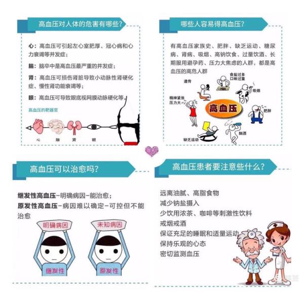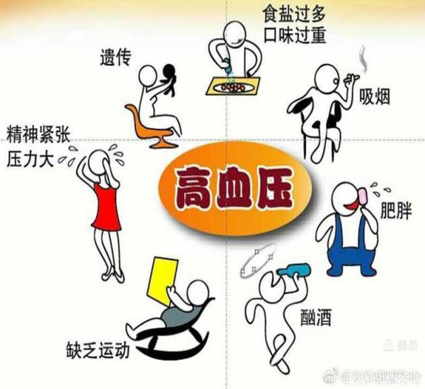 告诉人们超重和肥胖、高盐高油饮食、吸烟酗酒是高血压发生的主要危险因素,控制体重、减盐减油,戒烟限酒是防治高血压的有效措施(减少盐的摄入量可以降低血压,提倡每人每天平均食盐摄入量不超过6克);建议超重和肥胖者合理控制体重,18岁及以上成年人群体重指数应为18.5-23.9kg/m2(体重指数=体重kg/身高m2),并应合理控制腰围,男性﹤85cm,女性﹤80cm。
