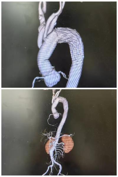 患者男性,55岁,主因“胸背痛5小时”入院。患者于2024年10月27日16时左右发病,就诊于外院行胸腹主动脉CTA提示主动脉夹层(Stanford A型),遂转到我院急诊。面对来势汹汹的疾病,患者家属并没有做好充分的准备,由于患者入院时即出现嗜睡,血压仅为90/56mmHg,且心脏彩超提示大量心包积液,术前主动脉CTA提示头臂干及右侧颈总动脉夹层受累,真腔明显受压,且肋间动脉及脊髓动脉均起自假腔,所以患者病情危重,随时都有生命危险,并且手术风险高,家属在得知患者的相关情况和手术风险后,变得手足无措,一度想放弃治疗,因为家中其他人也曾因重病治疗,结果人财两空,面对相似情况,家属陷入了两难的境地。