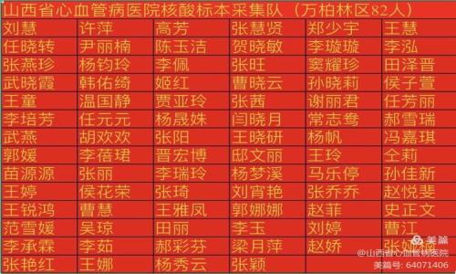 此次万柏林区核酸采样组82人,由刘慧护士长带队,分别在10个社区设立32个采集点,采集标本52563人次,入户采集38人,于19:30顺利完成任务。