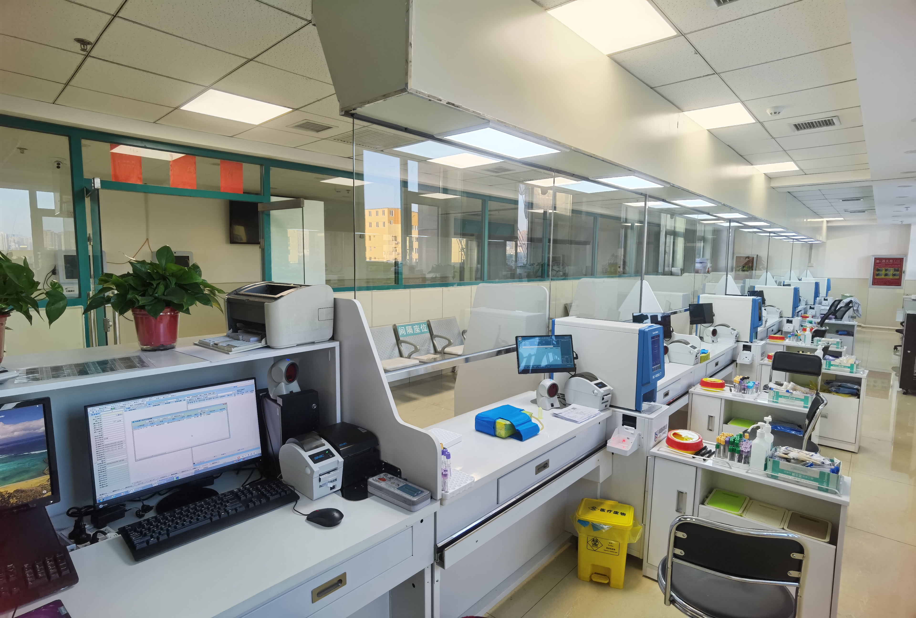检验科实验区位于医技大楼四层,占地1000余平方米,门诊四层设立采血中心占地约200平方米。现配有全自动生化免疫流水线分析系统,全自动血液分析流水线、全自动尿液分析系统、全自动粪便分析系统,全自动糖化血红蛋白分析仪,全自动特种蛋白分析仪,全自动免疫分析系统、全自动自身免疫分析系统,全自动血栓分析仪和血小板聚集仪等国内外先进设备,2022年我科又上线了全自动采血流水线和冷链监测系统。