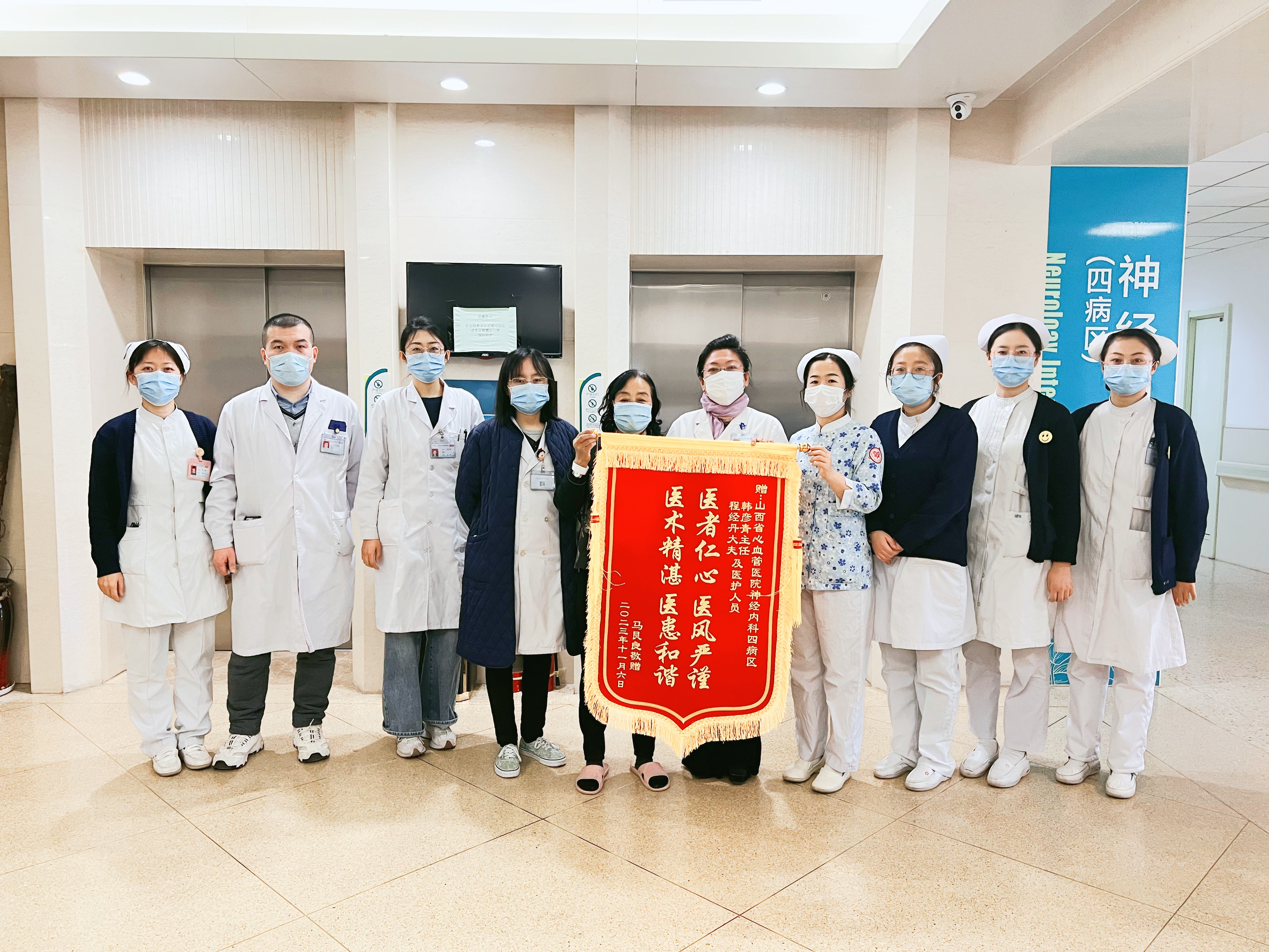 表扬表彰2023年11月29日在寒风凛冽的冬日,韩彦青主任在忙碌的门诊收到了已经出院患者送来的暖心锦旗,宛如冬日的暖阳照到每一位努力付出的医护心里。