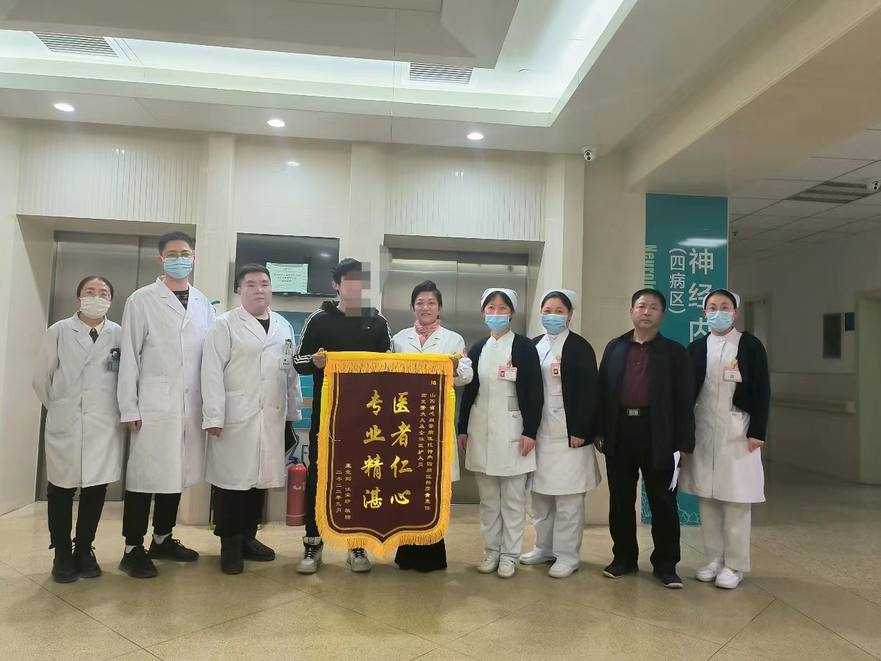 2023年7月3日患者王先生因反复言语含糊就诊于韩彦青主任门诊,韩彦青主任仔细询问病史,考虑为短暂性脑缺血发作,完善头颅CT除外出血性疾病后住院治疗,经过神内4病区韩彦青主任、高变芳主治医师及神内4医护的精心治疗后患者未再出现言语含糊症状,病情好转出院,出院后患者门诊复诊,各项指标控制良好,为表达对我院医护人员的感谢,患者及家属送来“医者仁心 专业精湛”的锦旗表示感谢,这是对我们工作的肯定,更是对我们的激励,在未来的路上我们定“不忘初心 不负使命”。