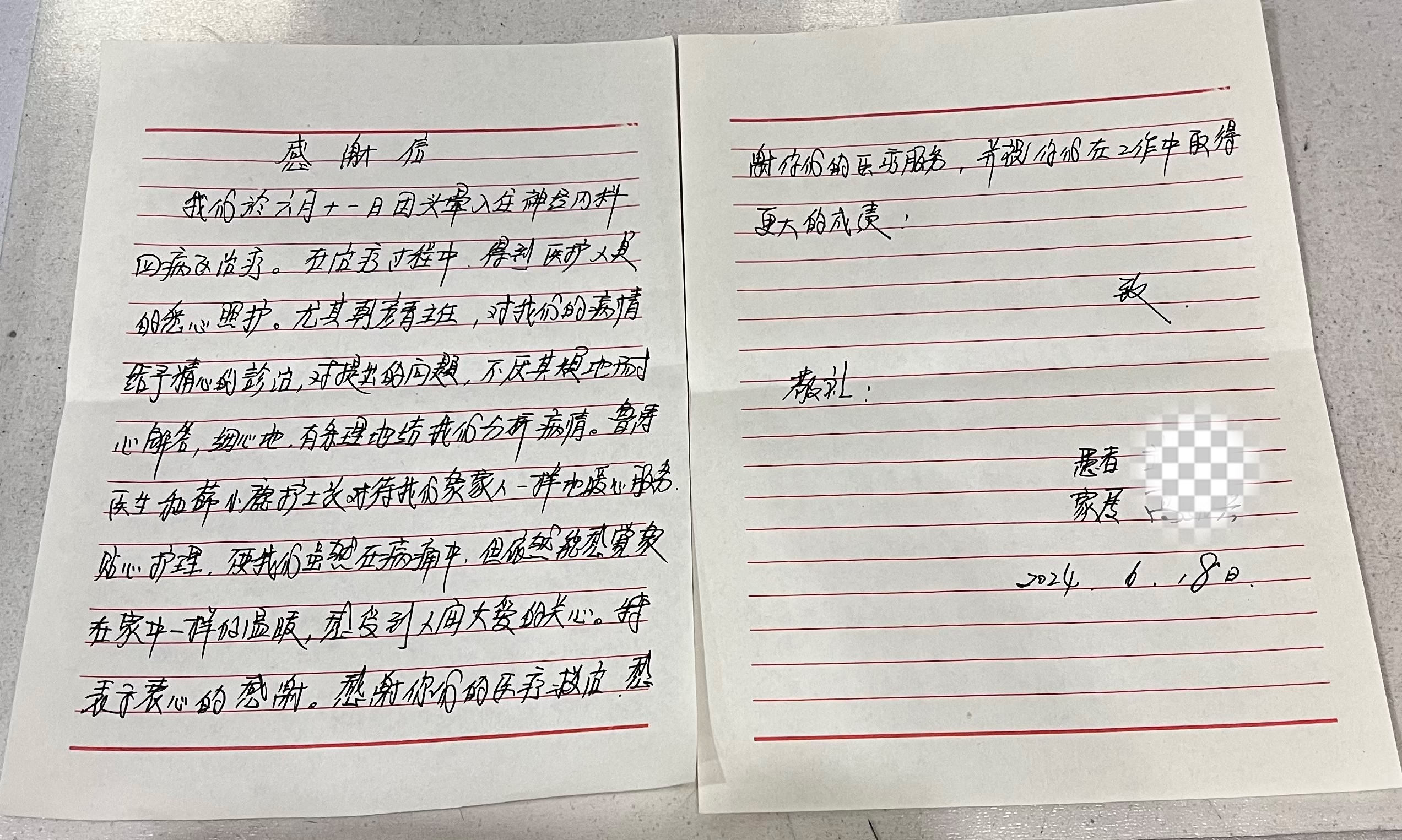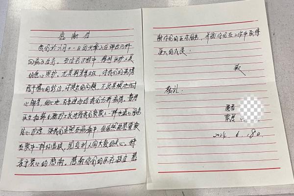 感谢患者和家属对我院和团队的褒奖:正像感谢信中提到的最感动的一句话:让患者和家属感受到回家的感觉,感受到家的温暖!感谢脑血管病、神经免疫和感染性疾病亚专业骨干鲁涛主治医的精心治疗,感谢薛小鹿护士长和团队提供的“优质护理+人文关怀”!患者和家属的信任鞭策我们不断提升医疗质量和文化品牌!我们一直在努力!